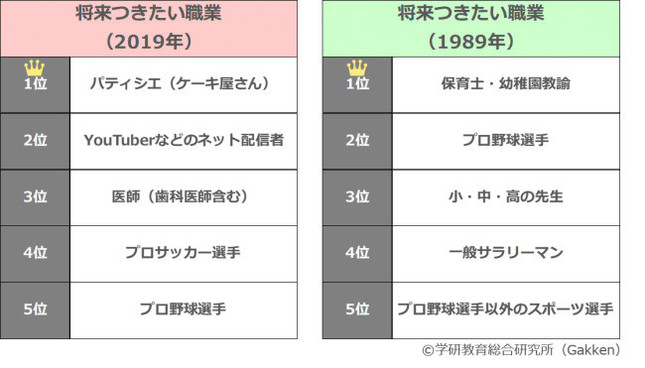 調査項目のひとつ「将来つきたい職業」では、小学生男子で前年1位だった「プロサッカー選手」に代わり、ユーチューバー(YouTuber)などのネット配信者が首位に立った。