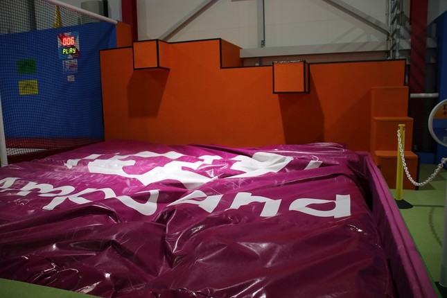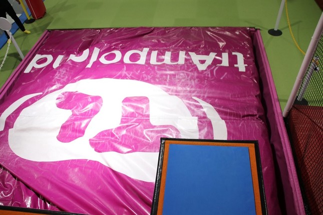 訪れたのは千葉県浦安市にある「トランポランドTokyo Bayside」。19年4月にオープンした屋内専用施設だ。純粋に跳ねて遊ぶことはもちろん、トランポリンをしながらドッジボールやダンクシュート、縄跳びができたり、巨大なエアーバッグに背面から飛び込む体験を楽しめたり、背中からトランポリンに着地し、弾みで壁を走れたりとさまざまなコンテンツが用意されている。