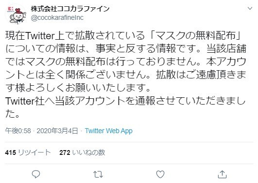 大手ドラッグストアチェーン・ココカラファインの公式ツイッターアカウントは、一部店舗で「マスクの無料配布」を実施しているというツイートが投稿されたことに対し「無料配布は行っておりません」と内容を完全否定した。