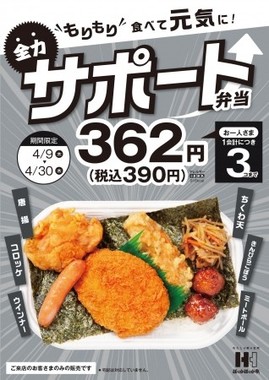 持ち帰り弁当チェーンのほっかほっか亭は、から揚やコロッケ、ウィンナーなど人気食材6種を詰め込んだ「サポート弁当」を、対象の地域にて2020年4月9日から4月30日の期間限定で販売する。