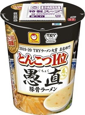 講談社が発行する「業界最高権威 TRY ラーメン大賞2019-20」の「名店部門とんこつ」で1 位を獲得した「愚直」。看板メニューの「とんこつラーメン」の味わいを再現した。これまでよりも硬く歯ごたえのある角麺に、クリーミーかつコクのある濃厚な豚骨スープが絡む。スープはフライドオニオン入り。別添の特製スープを加えれば、より本格的な味わいを楽しめるという。具材は味付豚肉、メンマ、ねぎ。