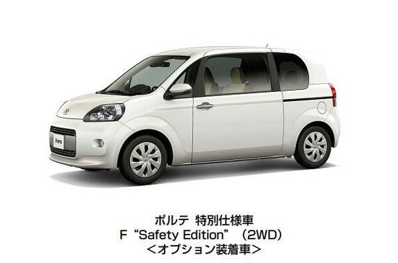 ポルテならびにスペイドの「F」、「G」をベースに、駐車場などでのアクセルとブレーキの踏み間違いやアクセルの踏みすぎなどで引き起こされる衝突被害を軽減するインテリジェントクリアランスソナー「パーキングサポートブレーキ(静止物)」を特別に装備。さらに、後退時に後方の視界をナビゲーション画面に表示するバックカメラを含むナビレディパッケージや、太陽光に近い色と大光量で夜間の運転をサポートするディスチャージヘッドランプなどを含むHIDパッケージを特別装備とし、安全・安心装備を充実させた。
