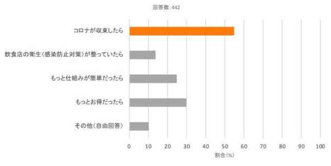 では、同キャンペーンを活用したいと思うか。56%が「思う」、44%が「思わない」と答えた。「思う」と答えた56%は、どのような店を利用したいか。答えは「行ったことがないお店」(60%)、「人気のお店」(40%)が上位に。「思わない」と答えた44%にどうすれば活用したいと思うか聞いたところ、「コロナが収束したら」(55%)との回答が最多だった。