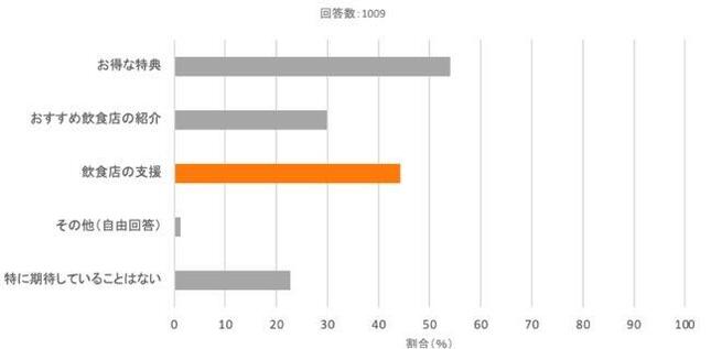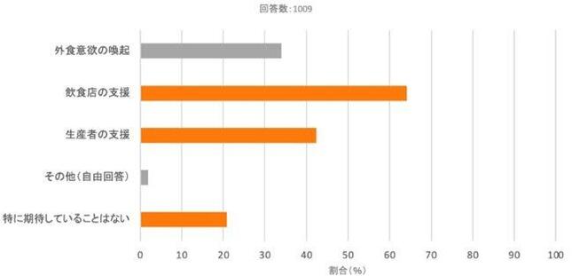 「『Go To Eatキャンペーン』にどのような効果を期待していますか?」との問いには、「飲食店の支援」が64%、「生産者の支援」が42%と多く、支援を期待する人が多いことがわかった。