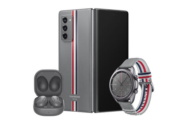 「Thom Browne」ブランドを象徴するマットグレーとトリコロールのデザインとカラーリングを施したSIMフリースマートフォン「Galaxy Z Fold2 5G」、完全ワイヤレスイヤホン「Galaxy Buds Live」、スマートウォッチ「Galaxy Watch3」のセット。限定仕様のパッケージに入っている。
