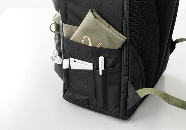 ほかにも様々な場所にポケットがある。前面の上ポケットには内側に「消臭ネーム」が付いており、菓子など香りの強いものを入れてもにおいが気にならない。田鍋さん自身が日常で感じた「大好きなお菓子を持ち歩きたいけど、においは気になる」という思いから、こうしたアイデアが生まれたそうだ。