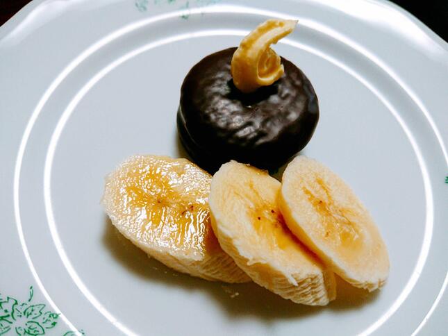 記者はチューブタイプのバターを使用した。チョコパイの上に好みの量だけバターを乗せ、皮を剥いてカットしたバナナを添える。これらを耐熱皿に乗せたのが画像2の状態。レンジで600ワット、20秒加熱する。出来あがりまで1分ほどだ。