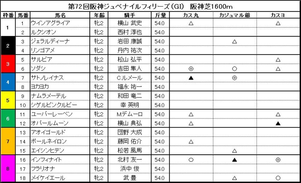 カス丸 はーい、ぼくカス丸きゃすう。先週のチャンピオンズカップは1番人気のクリソベリルがこけてしまい、当たらなかったじぇい。体調がよくなかったって言い訳だけど、本番に間に合うよう調整してほしいきゃすう。ザンネン! さて、今週はカス丸の一番大好きなレースだじぇい。阪神ジュベナイルフィリーズ(JF、2020年12月13日、阪神競馬場、芝1600メートル)。2歳牝馬のカワイ子ちゃんたちがナンバーワンを決める戦いきゃすう。出場する18頭ぜんぶを応援したいけど、予想もしなくちゃならないじぇい。いつも1番人気を本命◎にするガジュマル爺は、サトノレイナスを指名したきゃすう。