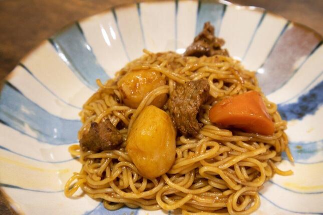 熱したフライパンに焼きそばを入れ、水100ミリリットルを加える。ほぐれてきたら材料を全て入れて炒め、水気が飛んできたら完成だ。元のカレーに具材が入っているのでボリューム感があり、しっかり満腹になれる。