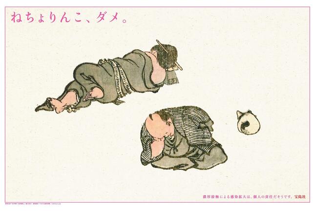 6日には同じく朝日新聞に「ねちょりんこ、ダメ。」が、やはり見開きで掲載された。こちらのメーンビジュアルは、江戸時代の男女が、互いの距離を取りながら背中を向けて寝ころんだり、すわったりしている姿を描いた北斎漫画だ。(原画/葛飾北斎『伝神開手 北斎漫画』。画像提供:すみだ北斎美術館 / DNPartcom)。