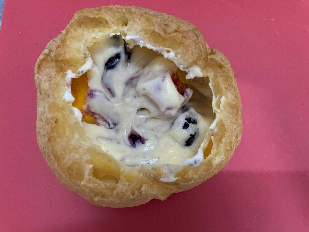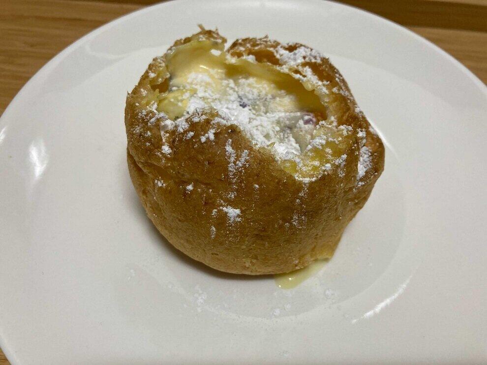 熱々のカスタードクリームは新鮮だ。冷えている状態よりもさらにクリーミーで甘く、フルーツの酸味と合わさって思わず口元がゆるむ。粉砂糖の優しい甘さも良い。また、シューの皮がパリパリで、いつもとはひと味違う食感が楽しめた。