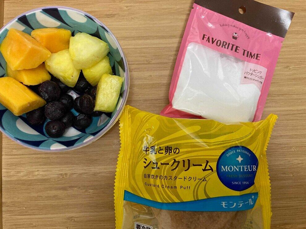 ・「牛乳と卵のシュークリーム」 ・お好みのフルーツ(今回はブルーベリー、パイナップル、マンゴー) ・粉砂糖