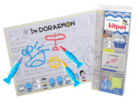 ドラえもんとコラボした、お風呂で楽しめるおえかきツール「キットパス for バスシート ドラえもん」。日本理化学工業の商品だ。描いた文字や絵は、スポンジや指でこすると消える。