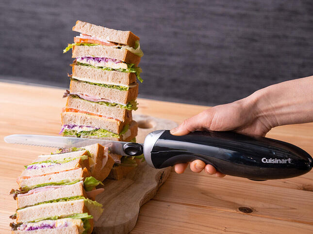 重なった2枚のブレード(刃)が前後に素早く動き、食材に沿えて電源ボタンを押すだけの簡単操作で、焼きたてのパンやジューシーな肉、水分のある野菜やスイーツなど切りにくい食材もきれいな断面でカットが可能。食材を傷めず、みずみずしさやおいしさを損ねないという。