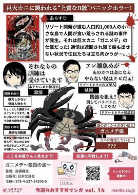 第14回は、閉ざされた孤島で巨大カニに襲われるパニックホラー「ガニメデ~殺戮の島~」(著: 高橋構造)。小さな島に古くから棲息する巨大なカニ「ガニメデ」によって島の住民たちが次々と殺されていく中、個性豊かな登場人物たちが力を合わせて立ち向かう。身の毛がよだつ殺戮シーンにも関わらず、クスリと笑える「B級感」が魅力だ。試し読みはこちらから。