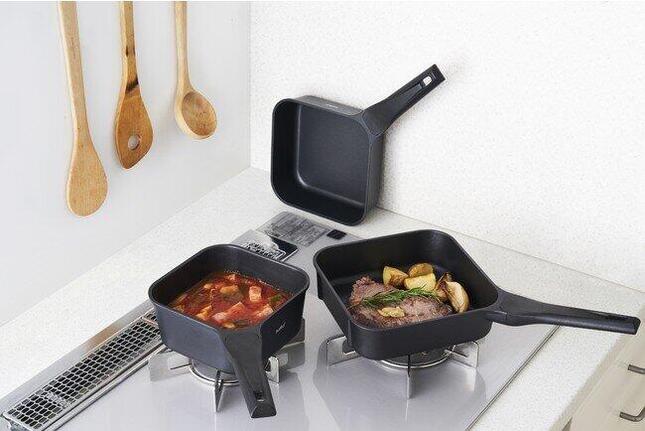「収納スペースが確保しづらく、重ね置きすると取り出しにくい」というフライパンの悩みに応え、自立可能な四角い形状を採用。一般的な丸型フライパンとは異なり、縦置きできてキッチン周辺の空きスペースにスッと収納できる。