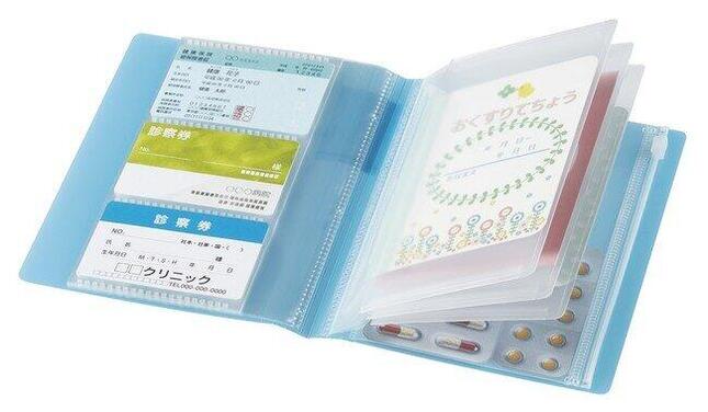 カード、おくすり手帳やクリップなど、医療・銀行・トラベル関連用品が保管・携帯できる。カラーバリエーションはいずれも黒、ライトブルー、白の3色。住空間と調和するナチュラルな色合いとなっている。