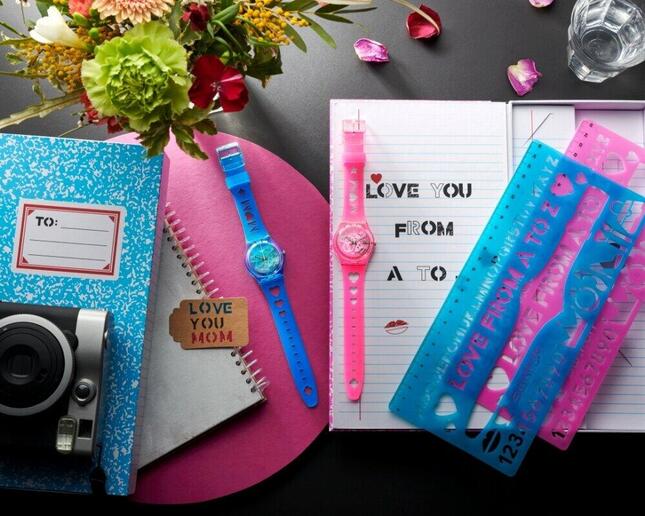 ノート風のスペシャルボックスを開けると、母の日スペシャルモデルとスウォッチ仕様のレトロな定規が入っている。宿題をしたこと、ラブレターを書いたこと、ファンシーな定規で角度を測ったことなど、たくさんの思い出を呼び起こしてくれる。