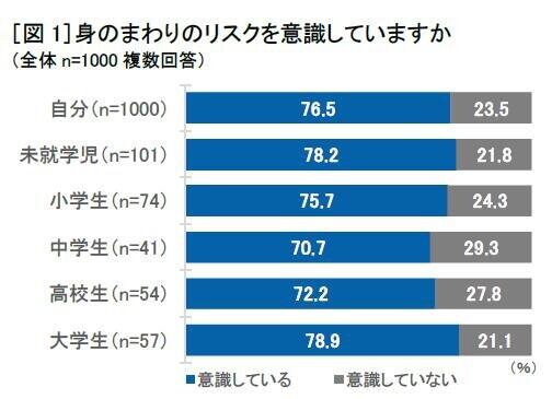 まず、身のまわりのリスクを意識しているかについて。76.5%が自分自身の身のまわりのリスクについて意識していると答えた。また、子どもに対するリスク意識は子どもの年齢が小さいほど高く、「未就学児」に対しては78.2%と特に高くなっている。
