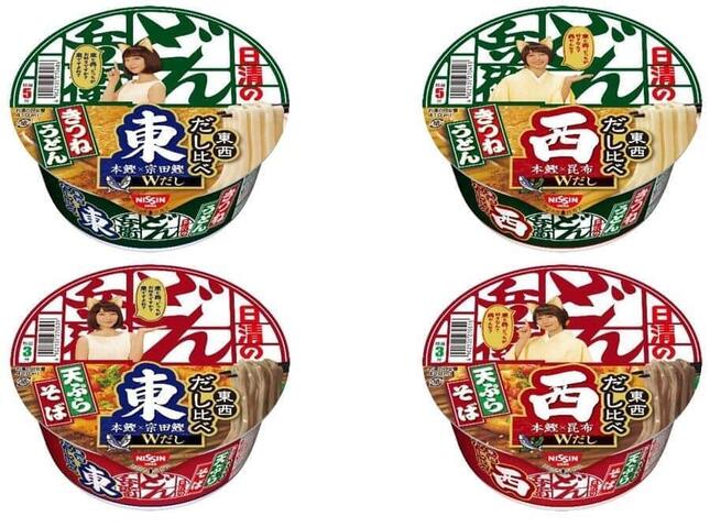 ラインアップは「きつねうどん だし比べ 東/西」「天ぷらそば だし比べ 東/西」の4品。パッケージにはテレビCMにも出演している吉岡 里帆さん扮する"どんぎつね"を起用。