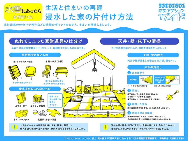 全国災害ボランティア支援団体ネットワーク(JVOAD)はウェブサイト上で、自然災害に見舞われた際にどうすればよいかをまとめた資料を公開している。水害については、「まず行うこと」と「お金や住まいの支援」の2種類があり、イラストを交えて被災後の生活再建のための準備を分かりやすく説明している。記者はそれぞれを読み込んだうえで、JVOAD事務局長の明城徹也さん、広報部の神元幸津江さんに内容のさらなる解説を求めた。
