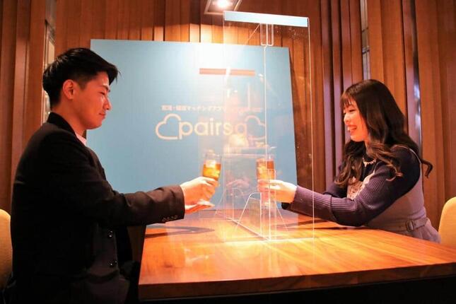 マッチングアプリ「Pairs(ペアーズ)」と、音響や感染症の専門家が開発した「声が届きやすい 距離が縮まるパーテーション」が2021年12月1日に設置され、この日から希望店舗の募集も始めている。