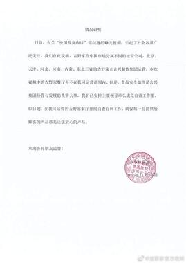 騒動を受けてウェイボの吉野家公式アカウントは同日夜、「状況説明」というタイトルの文書を発表。その中で、こう釈明した。