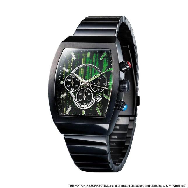 主人公・ネオをイメージした黒のバンドとケースや、文字盤にデザインされた暗闇で光るマトリックス・コードの緑がアクセントとなったスタイリッシュなデザインが特徴。文字盤にはクロノグラフ分針・小秒針・24時間針の3つのインダイヤルがレイアウトされ、クロノグラフ用のボタンは赤と青のカプセルをイメージした。赤のボタンを押すことで時間の計測ができるという。