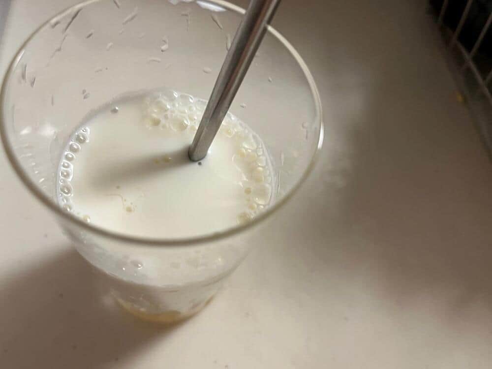 ネット上には「酢」と「はちみつ」を入れるというレシピもある。酢を加えることで、「ヨーグルト」風になるという。牛乳150ミリリットルにりんご酢大さじ1杯と、はちみつ大さじ1杯を加えて混ぜた。牛乳と酢のにおいがキッチンに漂う。これでおいしくなるとは、想像しづらい。