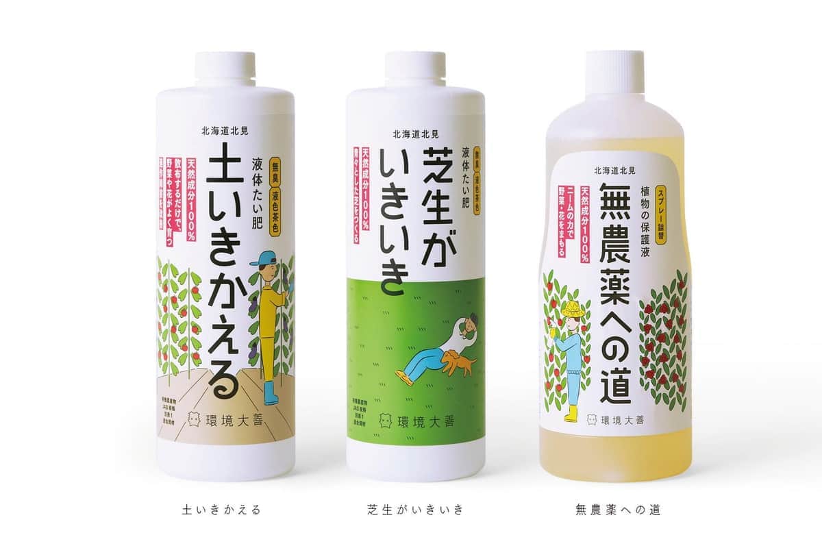 環境大善(北海道北見市)は、土壌改良材「液体たい肥 土いきかえる」「無農薬への道」など、園芸・農業用資材のパッケージデザインを2022年2月1日にリニューアルした。