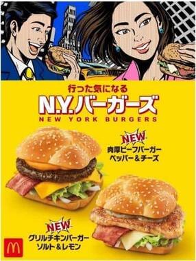 日本マクドナルドは、ニューヨークをイメージした新シリーズ「行った気になる N.Y.バーガーズ」として「肉厚ビーフバーガー ペッパー&チーズ」「グリルチキンバーガー ソルト&レモン」の2種を、2022年2月9日に発売した。
