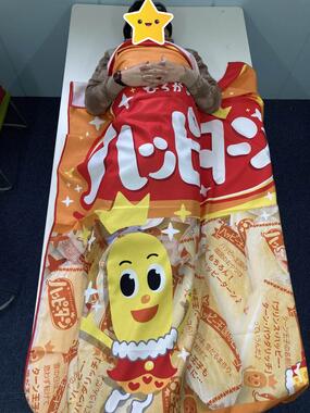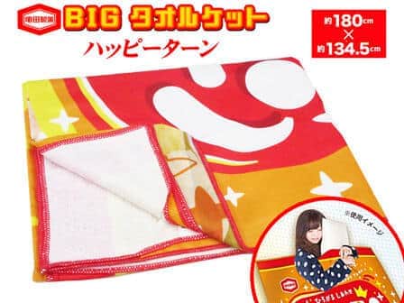 亀田製菓の米菓「ハッピーターン」のパッケージがプリントされた「BIG タオルケット ハッピーターン」。玩具問屋「堀商店」(愛知県名古屋市)の成瀬昭則さんは、春になり、公園など屋外に遊びに出かけることが多くなるこれからの時期「持って出かけると何かと便利」だという。