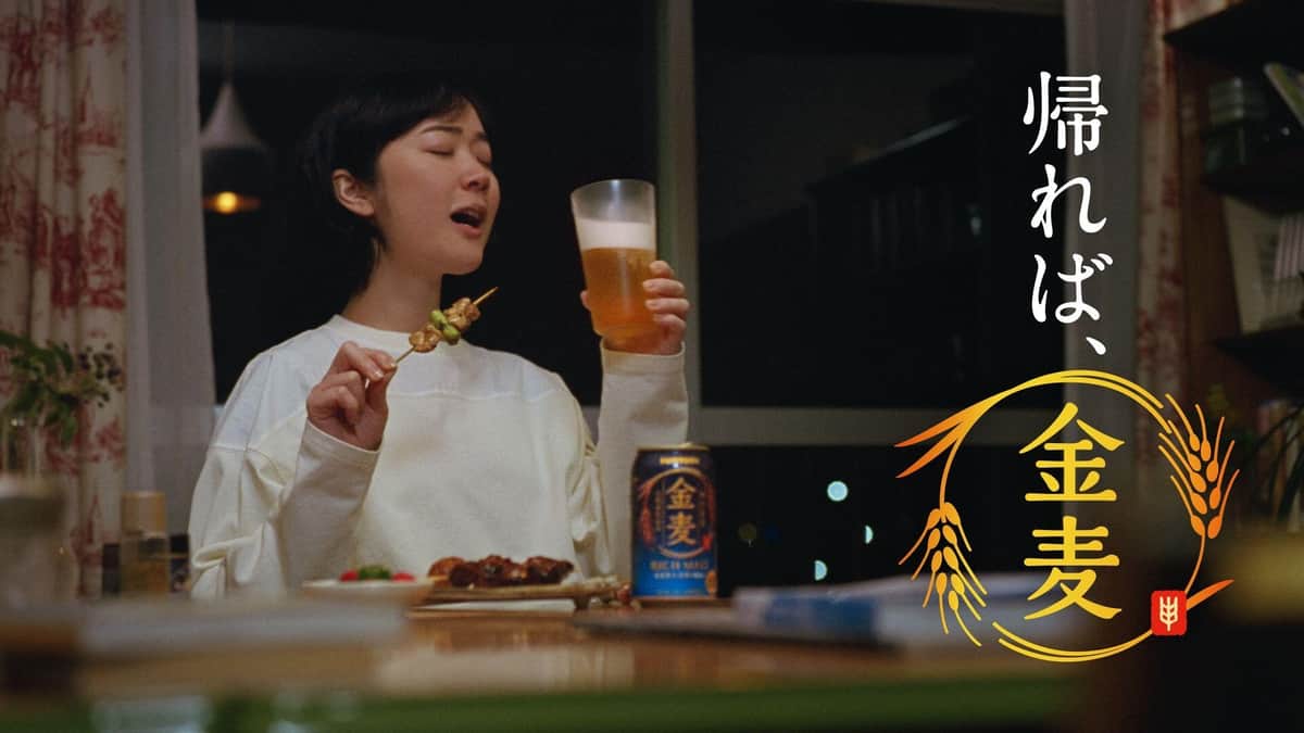 その後、すっかり日が暮れ、急いだ様子で帰宅した黒木さん。玄関の電気をつけると、その手には屋台で買ったやきとりの袋が提げられていた。冷蔵庫から冷えた金麦を取り出し、おつまみを片手に飲む黒木さんのカットに、「帰れば、金麦」というナレーションが重なる。