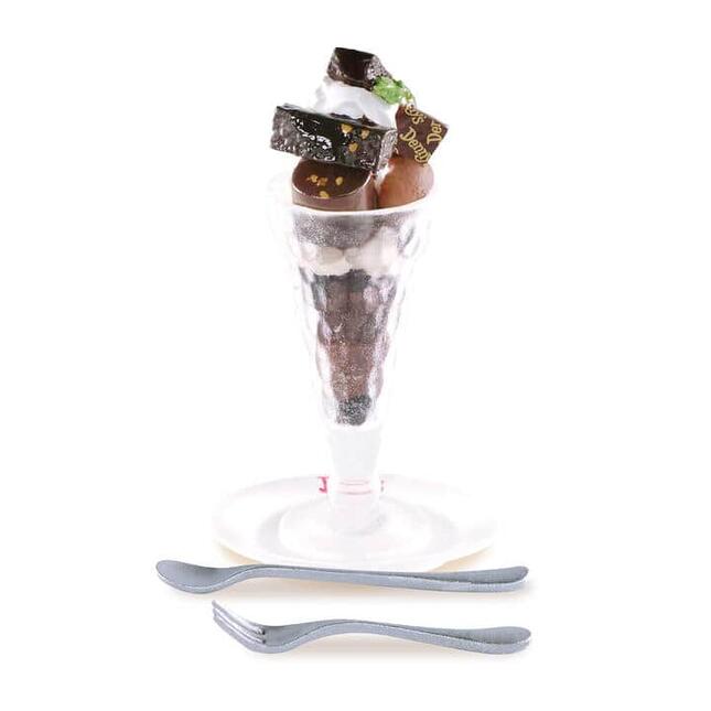 「DEVIL'S ブラウニーサンデー」は、トールグラスの透明感や凹凸模様を表現。トッピングのチョコプレートには、本物と何度も見比べてバランスを調整したという同チェーンのロゴをプリント。パフェパーツとグラスは取り外し可能な非接着式となっている。