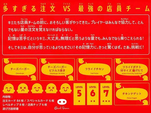 バーガーショップの店員となり、とんでもない量の注文を覚え、みんなで協力してオーダーをこなす「注文の多すぎるゲーム バーガー」。レベルが上がると、ピクルス抜きなどの「めんどくさい」注文が増えていく。