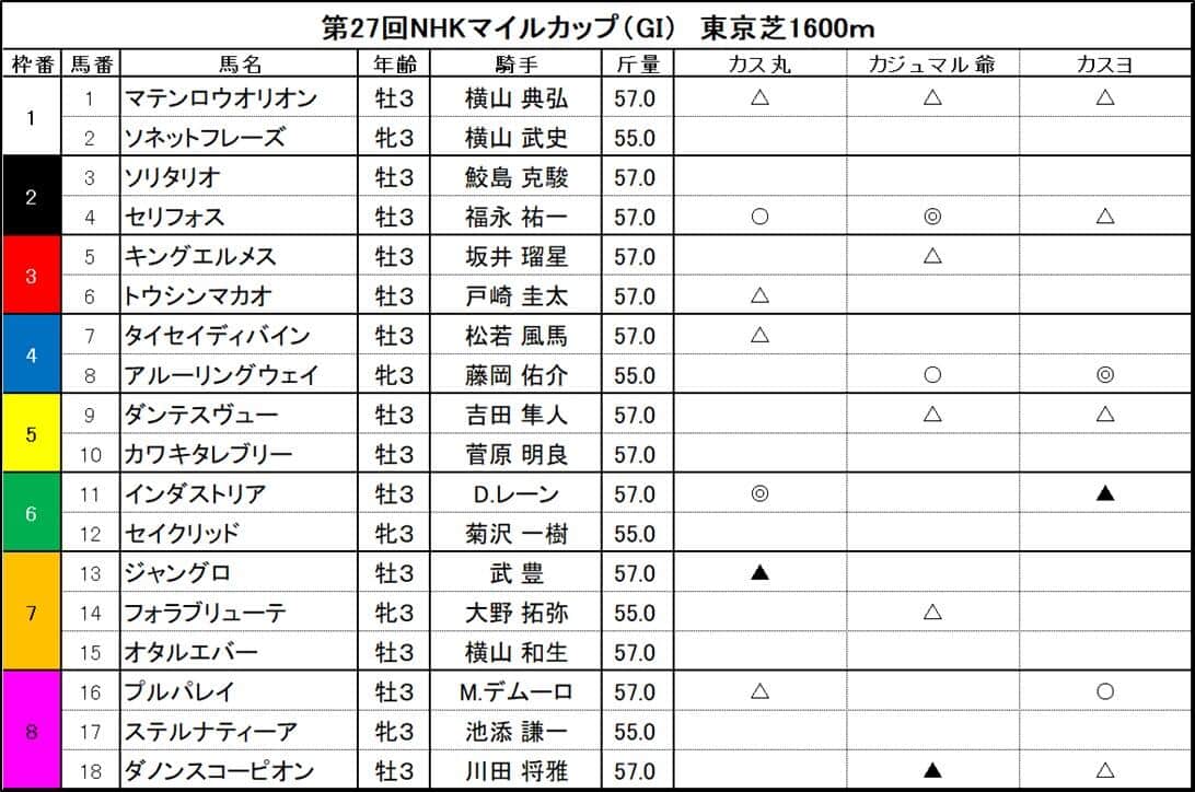 カス丸 はーい、ぼくカス丸きゃすう。先週の春の天皇賞・春はガジュマル爺が〇◎△で三連複当てたじぇい。やっとこさきゃすう。今週は距離も短くなってNHKマイルカップ(2022年5月8日、東京競馬場、芝1600メートル)だじぇい。3歳のマイルのチャンピオンを決めるレースきゃすう。どんぐりの背比べで、毎年このレースは悩むじぇい。2週連続当てたい爺の本命◎は1番人気が予想されてるセリフォスきゃすう。爺はとにかく1番人気を本命にすることしか能がないみたいだじぇい。