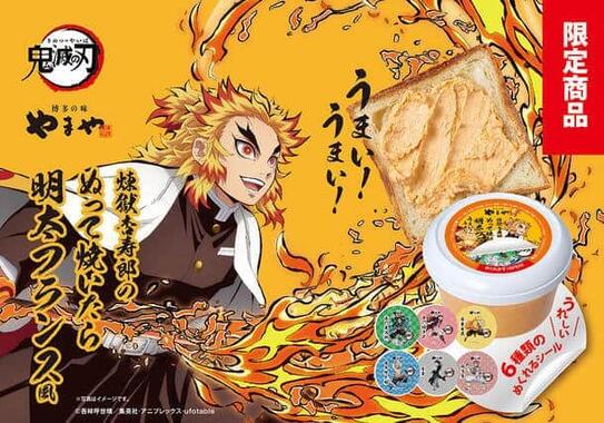 やまやコミュニケーションズ(福岡市)は、アニメ「鬼滅の刃」のキャラクターシール付きコラボ商品「煉獄杏寿郎のぬって焼いたら明太フランス風」を2022年5月1日に発売した。