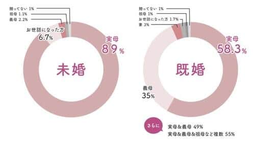 風呂グッズの企画販売などを行うバスリエ(千葉県我孫子市)が2022年4月26日に公表した、「母の日ギフト」の調査結果(男女400人)を引用しよう。回答者から未婚者を除き、既婚者に絞って、誰に母の日ギフトを贈っているか、調べた結果が下記グラフの右側だ。