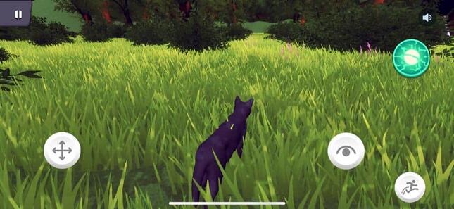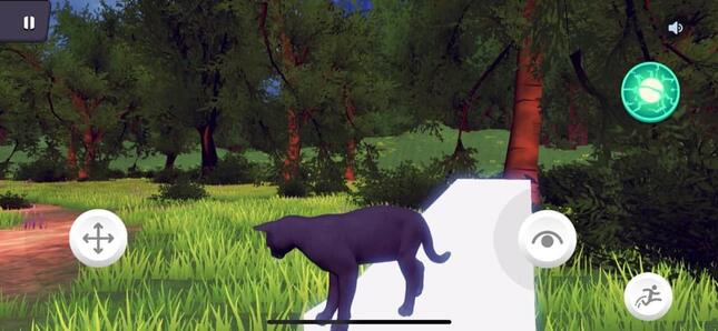 ログインすると、画面には木々に囲まれた森林が広がる。青空は澄み、草は青々としており、なかなかの美麗グラフィックだと感じる。ネコの配色はランダムで決まる。記者のアバターは、紫色に近い黒ネコだ。