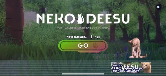 休日の17時ごろにアプリを起動すると、タイトル画面には「Now cats are... 3/20」とのメッセージが表示された。最大20匹だが、現在3匹しかいないようだ。