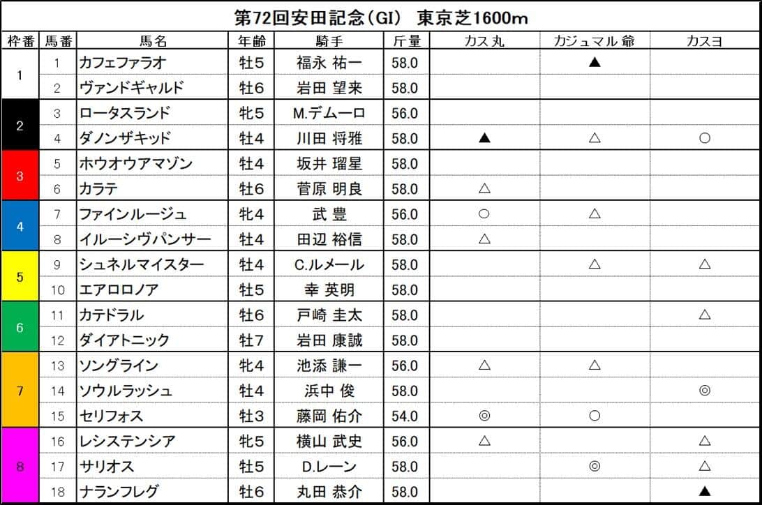 ガジュマル爺 わしは4頭じゃな。まずは単穴▲にカフェファラオじゃ。昨年と今年のダートGI、フェブラリーステークス(東京ダ1600メートル)を連覇。東京のダート1600メートルは、それらを含む4戦4勝と無類の強さを発揮しておる。芝コースは昨夏の函館記念(GIII、函館2000メートル)以来、2戦目。函館記念では初芝にもかかわらず1番人気に推されたが、終始中団(16頭立て)のポジションで伸びることなく9着に終わったんじゃ。ただ、やや距離が長かったことや58.5キロの酷量を負っていたことを考えると、もう少し走れてもいいはずじゃ。今年のフェブラリーSの走破タイムが芝コース並みの1分33秒8と驚異的だったこともある。さらに、そこで3着だったソダシがぶっつけのローテーションで芝のGI、ヴィクトリアマイル(東京1600メートル)を制したことを考えると、すんなり勝っても不思議ではないわい。堀亘行調教師は現役最多の安田記念3勝。サリオスとの2頭出しで4勝を目指すというわけじゃな。 2頭目は昨年本命◎にしたシュネルマイスターじゃ。前走の海外GI、ドバイターフ(UAEメイダン、芝1800メートル。日本のパンサラッサと英ロードノースが1着同着)で1番人気に推されながらも8着と、初めて大敗を喫したんじゃ。しかし、国内では7戦4勝2着2回3着1回とすべて馬券圏内(3着以内)で、唯一の3着が昨年のこのレース。NHKマイルカップを制して臨んだ初の古馬との対戦じゃったが、勝ったダノンキングリー、2着のグランアレグリアに、上がり(最後の600メートル)32秒9の脚で食らいついとった。この2頭が引退して不在なら、十分に主役を貼れる1頭ではあるはずじゃ。ただ、不安材料は海外帰りであることじゃ。ドバイターフのレース後、クリストフ・ルメール騎手は「敗因がわからない」とインタビューで答えておった。馬場が合わなかったのなら敗因がはっきりしておるが、馬自身の体調や精神状態が問題であったとすれば、帰国後の初戦から走れるかどうか心配だなところじゃ。 3頭目は、ファインルージュじゃな。9戦して3勝2着4回3着1回。唯一、馬券圏内(3着以内)を外したのが東京2400メートルのGIオークスだけ。GI成績も昨年の桜花賞(阪神1600メートル)で3着、秋華賞(阪神2000メートル)と前走のヴィクトリアマイルの2着と、どれも惜しいレースばかりじゃ。1600メートルの距離に限っても、GIIIフェアリーステークス(中山)で優勝したほか、桜花賞3着、初の古馬相手の前々走、東京新聞杯(GIII、東京。勝ち馬はイルーシヴパンサー)とヴィクトリアマイルが2着とすべて馬券圏内に入っておる。鞍上が、先週50代で6勝目の日本ダービーを制した武豊騎手に乗り替わるのもプラスじゃな。安田記念は牝馬が好成績を残すレースだけに、一発の期待は大きいはずじゃ。 最後の1頭がソングラインじゃ。こちらも牝馬じゃな。昨年のNHKマイルカップを7番人気ながら、池添謙一騎手を背に広く長い東京コースの直線を一気に抜け出すと、追い込んできたシュネルマイスター相手に、あわやと思わせるデッドヒートを演じておった。ハナ差の2着に敗れたとはいえ、その時の脚は強烈。マイル戦までならGIでも通用すると思わせたんじゃ。もともと、その年の紅梅ステークス(1勝クラス、中京)を1400メートル戦とは思えぬ、3馬身差で楽勝(2着はララクリスティーヌ)すると、次走の桜花賞でも穴人気(7番人気、結果は15着)になっとった。東京のマイル戦は未勝利勝ち、GIIの富士ステークス勝ちを含め、4戦2勝2着1回と得意。2番人気ながら、5着に終わった前走のヴィクトリアマイルは2月の海外遠征(GIII、1351ターフスプリント、サウジアラビア芝1351メートル。1着)帰りだったことを思えば、叩き2戦目のこのレースこそ勝負じゃな。主戦の池添騎手が引き続き手綱をとることも心強いわい。