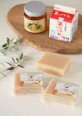 生乳からチーズを作る過程で廃棄される「ホエイ」(乳清)を活用して作った「京都ミルクせっけん」に、「美山産とち蜂蜜」を加えたもの。