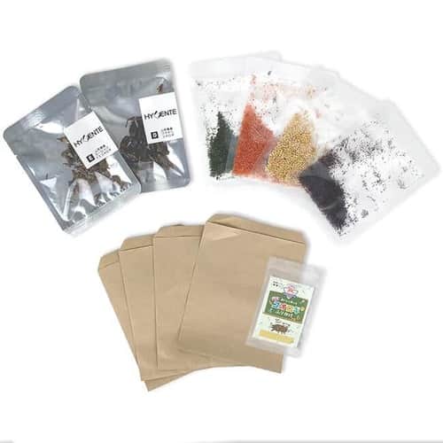砂糖としょうゆで味付けされた乾燥コオロギ(丸ごと)を、自分で砕き、付属の赤しそ、青しそ、めんたいこ、3種のふりかけの素とゴマを合わせ、好みの味のふりかけを作れる。
