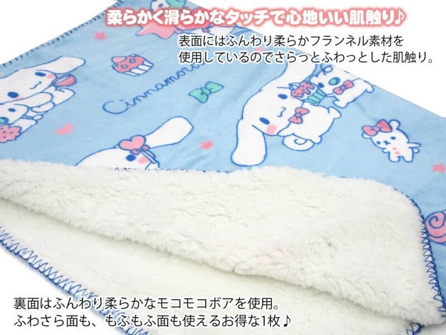 体調管理が難しいこの時期、急に寒くなった時に恋しくなるのが「ひざ掛け」。2022年に生誕20周年を迎えたシナモロールの「フランネルボアひざ掛け」はいかがだろう。表面は肌ざわりが良く暖かいフランネル素材、裏面はボア素材を使っている。