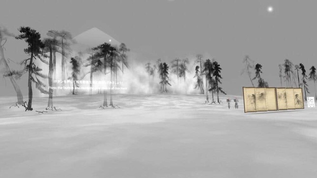 1つめの空間では安土桃山時代の絵師、長谷川等伯による屏風画「松林図屏風(しょうりんずびょうぶ)」を表現している。水墨による黒1色の濃淡で、松林の遠近感を表現した作品だ。