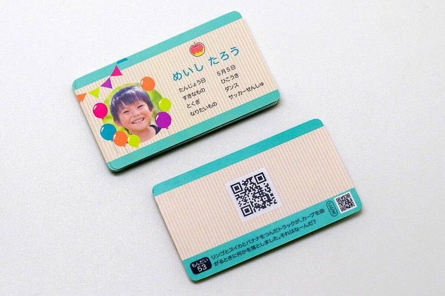 「こども名刺」には、本人のニックネームや顔写真、誕生日のほか、将来の夢や特技も入れられる。