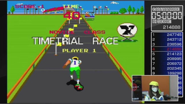 しかも自機が抜いた敵の人数(PASSED MAN)が一定数以上になると、残り時間にかかわらず、強制的に次のレースに進んでしまう。まとめると、スピードをセーブし、抜いた人数を常に把握しながら、転ばないように敵を倒し続ける必要がある。ローラージャマーの自機をイメージした出で立ちでスタジオ入りし、気合いで難局を乗り越えようとしたJ子だが、「TIME TRIAL」スタート早々、とんでもない展開に...... (1:44:15~)
