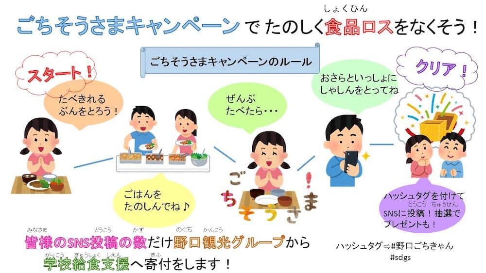 宿泊する子どもが食事を楽しんだ後、完食後のお皿と一緒に写真を撮影、専用のハッシュタグ「#野口ごちきゃん」と「#sdgs」をつけてSNSに投稿。投稿された分だけ、野口観光グループから学校給食支援へ寄付される。