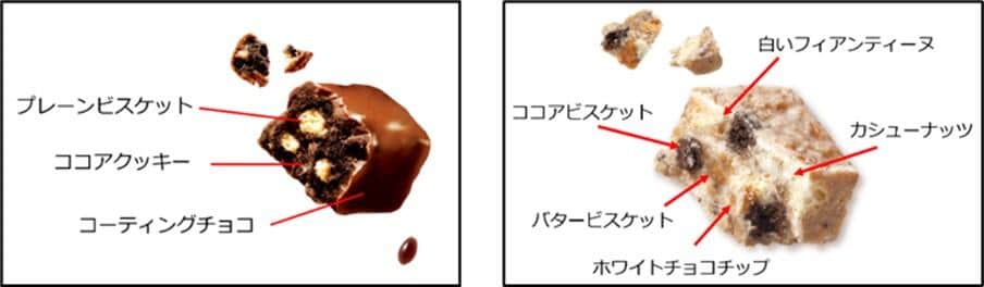 発表資料を見ると、中にはちょっとビターなココアビスケット、バタービスケット、ホワイトチョコチップ、カシューナッツ、白いフィアンテーヌ(薄く焼いたクレープ生地を細かく砕いたもの)が入っているそう。
