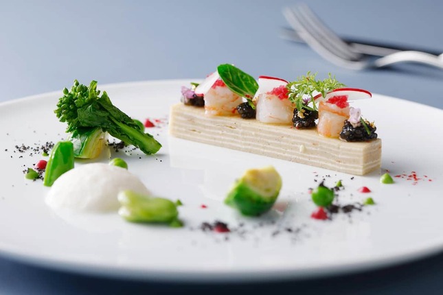 一般的な市販の瓶詰キャビアなどは7~10%の比較的高濃度の塩分で味付けされているが、同ホテルのオリジナルキャビアは塩分を3%に抑えている点も特徴だ。コース料理では前菜として「国産自家製キャビアとほんのり山葵を利かせたそば粉のガトー仕立て ボタン海老とフィンガーライム 季節のお野菜のマリネと共に」のほか、魚料理や黒毛和牛フィレ肉の炭火窯焼等を用意した。